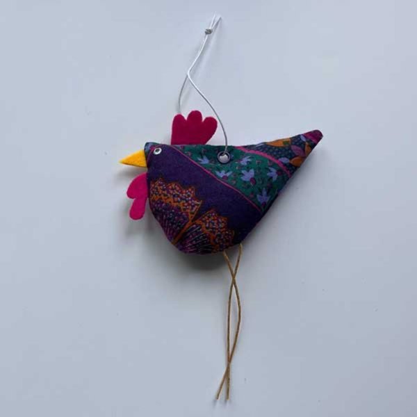 Oster-Henderl aus Stoff zum Aufhängen, Kamm und Schnabel aus Filz, 12 cm breit, 9 cm hoch (mit den Beinen ca 16 cm hoch). Aufhängeschlaufe aus gewachster Baumwolle.