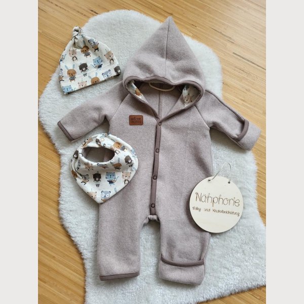 Handmade Baumwollfleeceanzug (100% Baumwolle) mit Umschlagbündchen an Händen und Füßen mit Knotenhaube aus Bio-Baumwolljersey und einem Wasserfallhalstuch aus Bio-Baumwolljersey mit Fleece-Unterseite - als Anzug für Draußen (Drüberanzug/Outdooranzug)