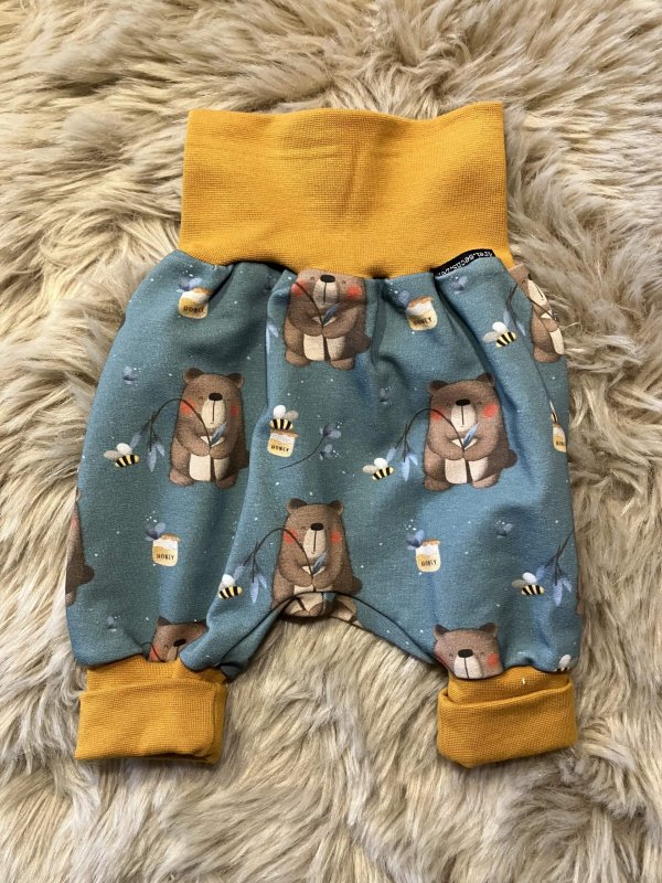 Pumphose "Honigbär" in der Größe 50/56, genäht aus Baumwollsweatstoff (95% Baumwolle, 5 % Elasthan), über zwei Größen mitwachsend, handmade im Burgenland