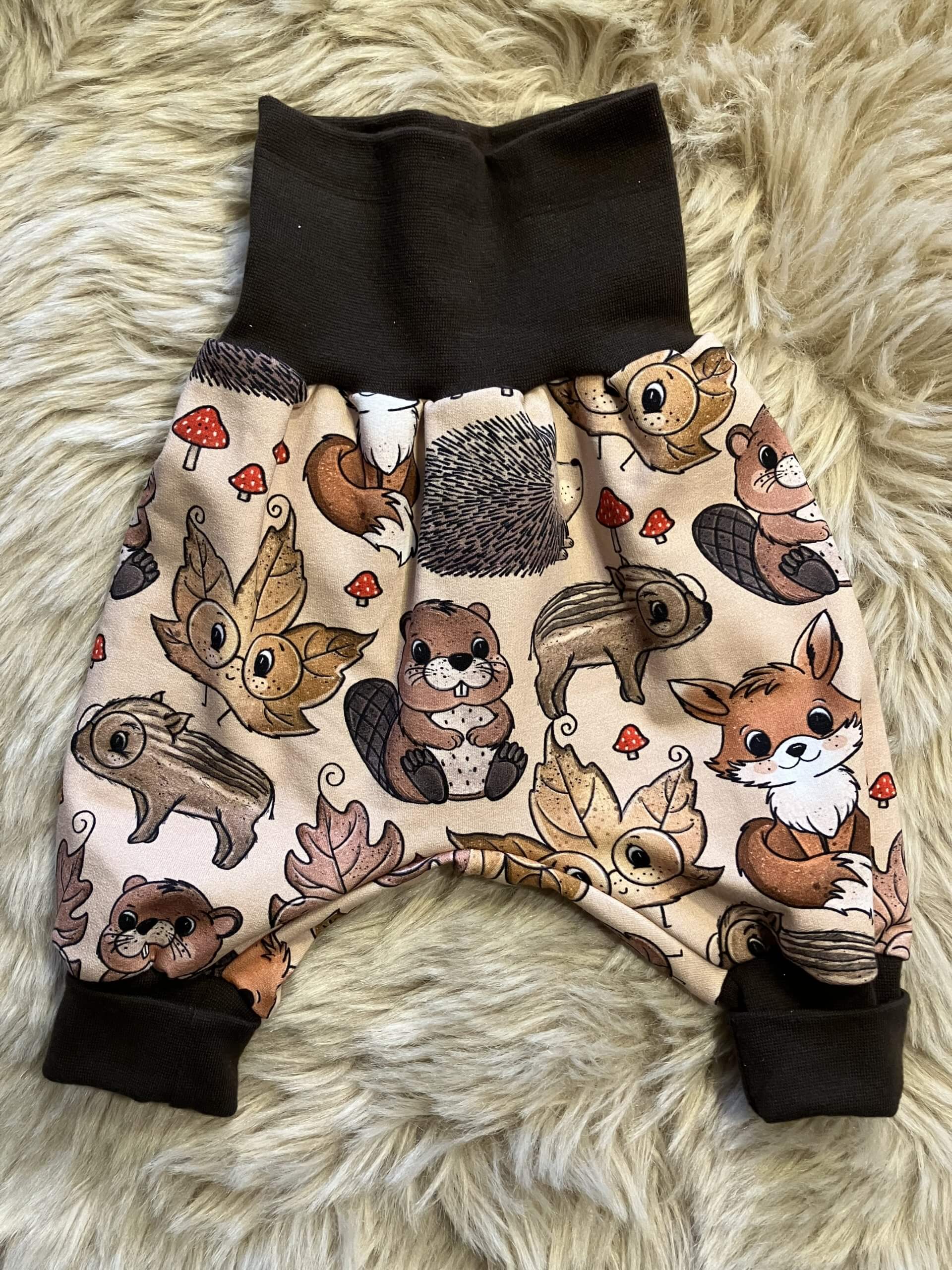 Pumphose "Waldleben1" in der Größe 62/68, aus Baumwoll-Sweatstoff (95% Baumwolle, 5% Elasthan), genäht im Burgenland.