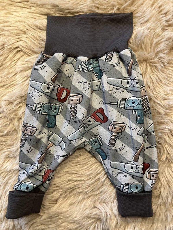 Pumphose "Werkzeuge dunkelgrau" in der Größe 74/80, genäht aus Bio-Baumwollsweatstoff (95% Baumwolle, 5 % Elasthan), über zwei Größen mitwachsend, handmade im Burgenland