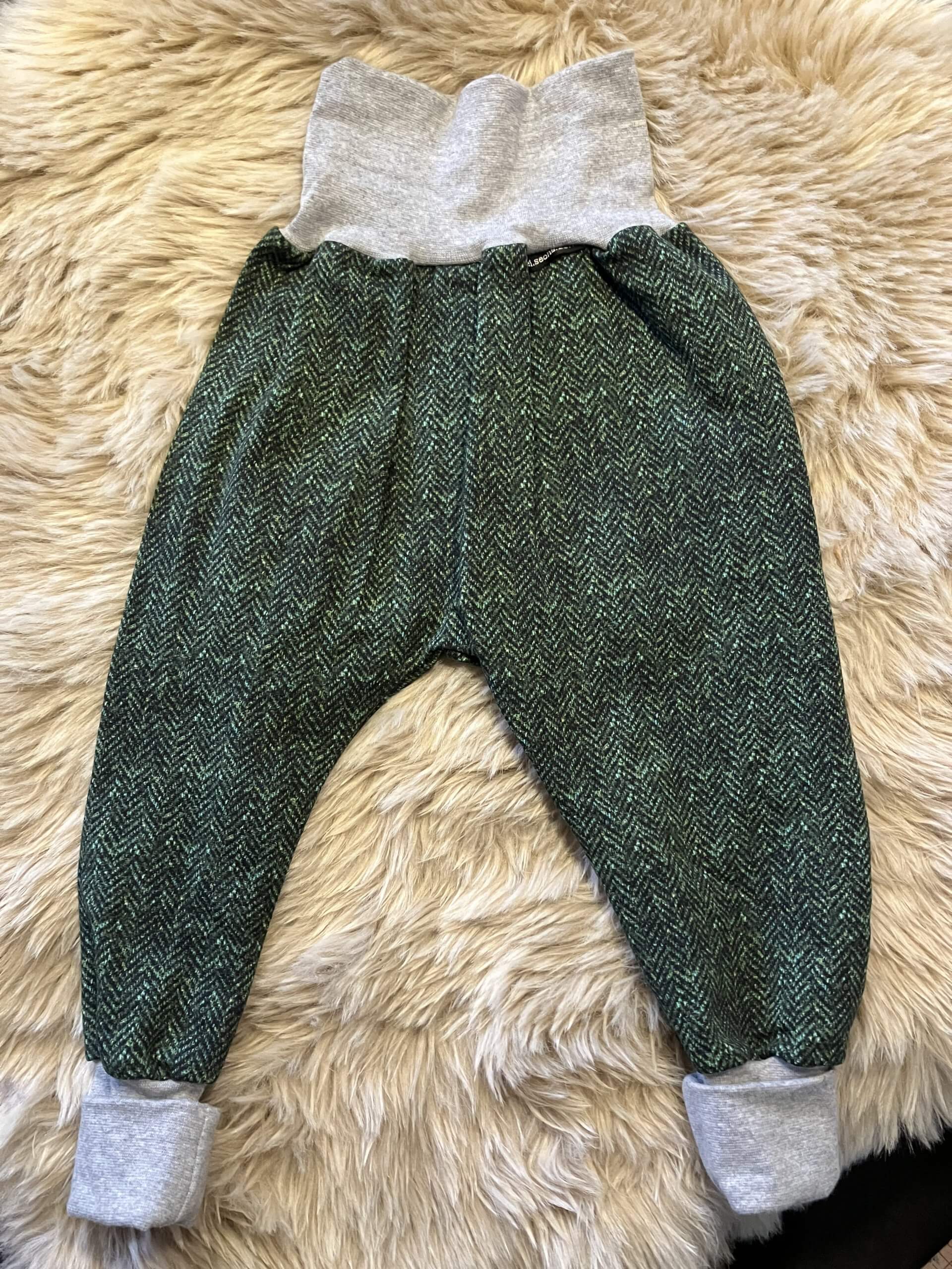 Pumphose "Geo grün" in der Größe 98/104. Aus Baumwollsweat, über zwei Größen mitwachsend, handmade im Burgenland.