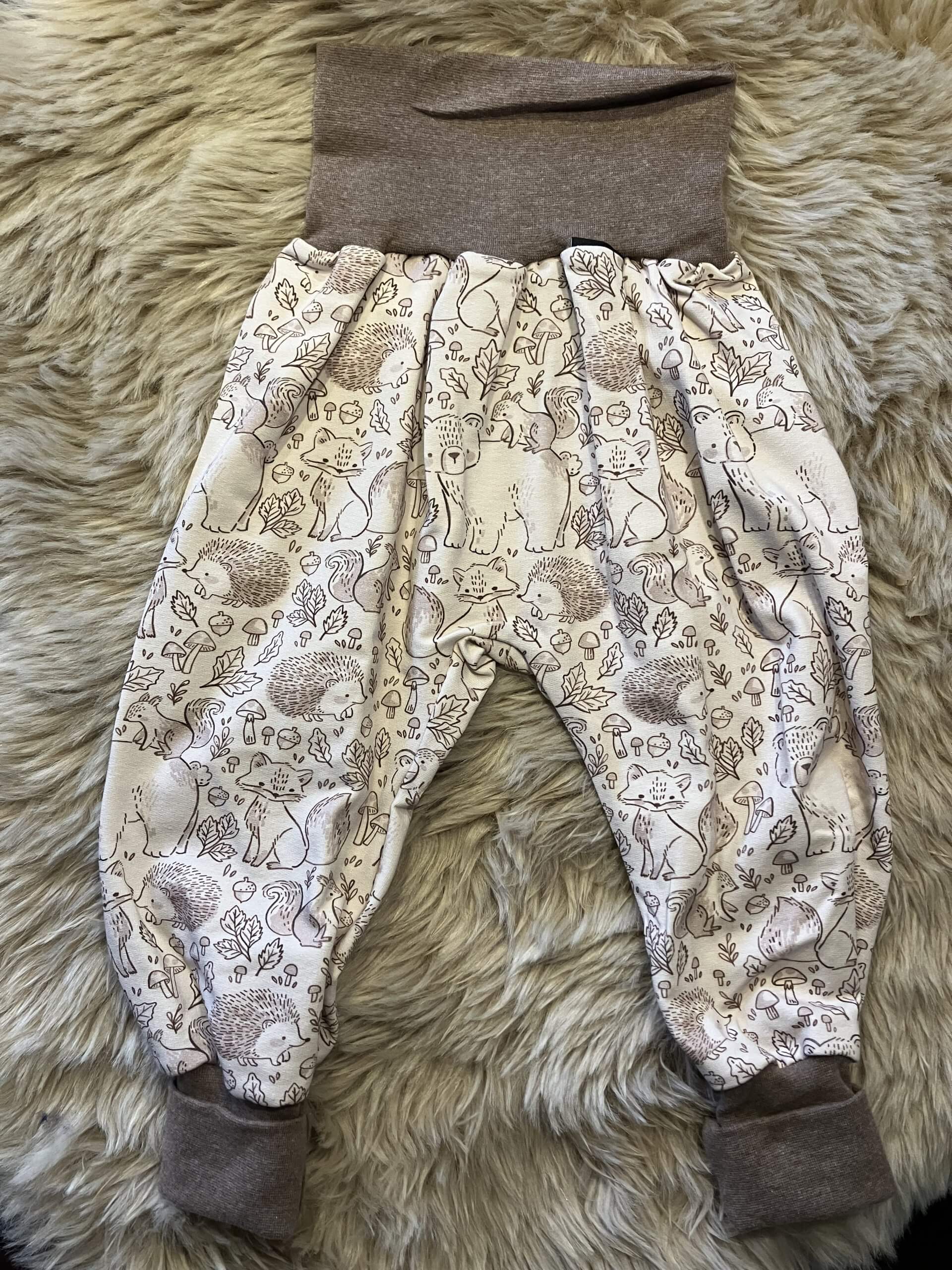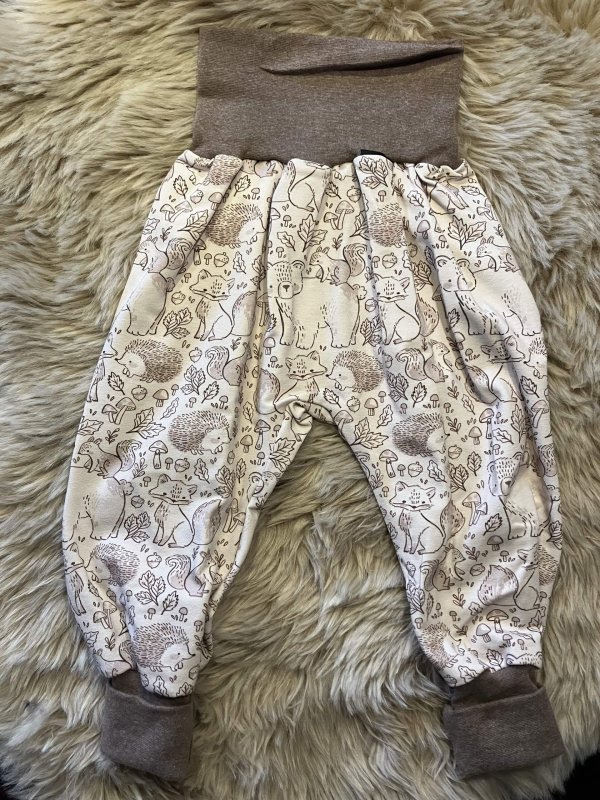 Pumphose "Waldtiere creme" in der Größe 98/104. Aus Bio-Baumwollsweat, über zwei Größen mitwachsend, handmade im Burgenland.