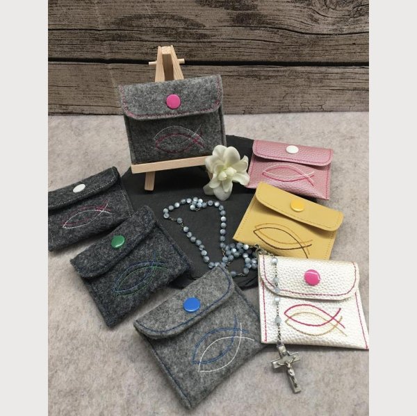 Schönes Rosenkranztäschchen aus Filz oder Kunstleder bestickt mit Motiv. Das Täschchen wird mit einem Druckknopf geschlossen. Auf Wunsch kann auch der Name des Kindes oder das Datum der Erstkommunion aufgestickt werden. Aufpreis € 2,00.