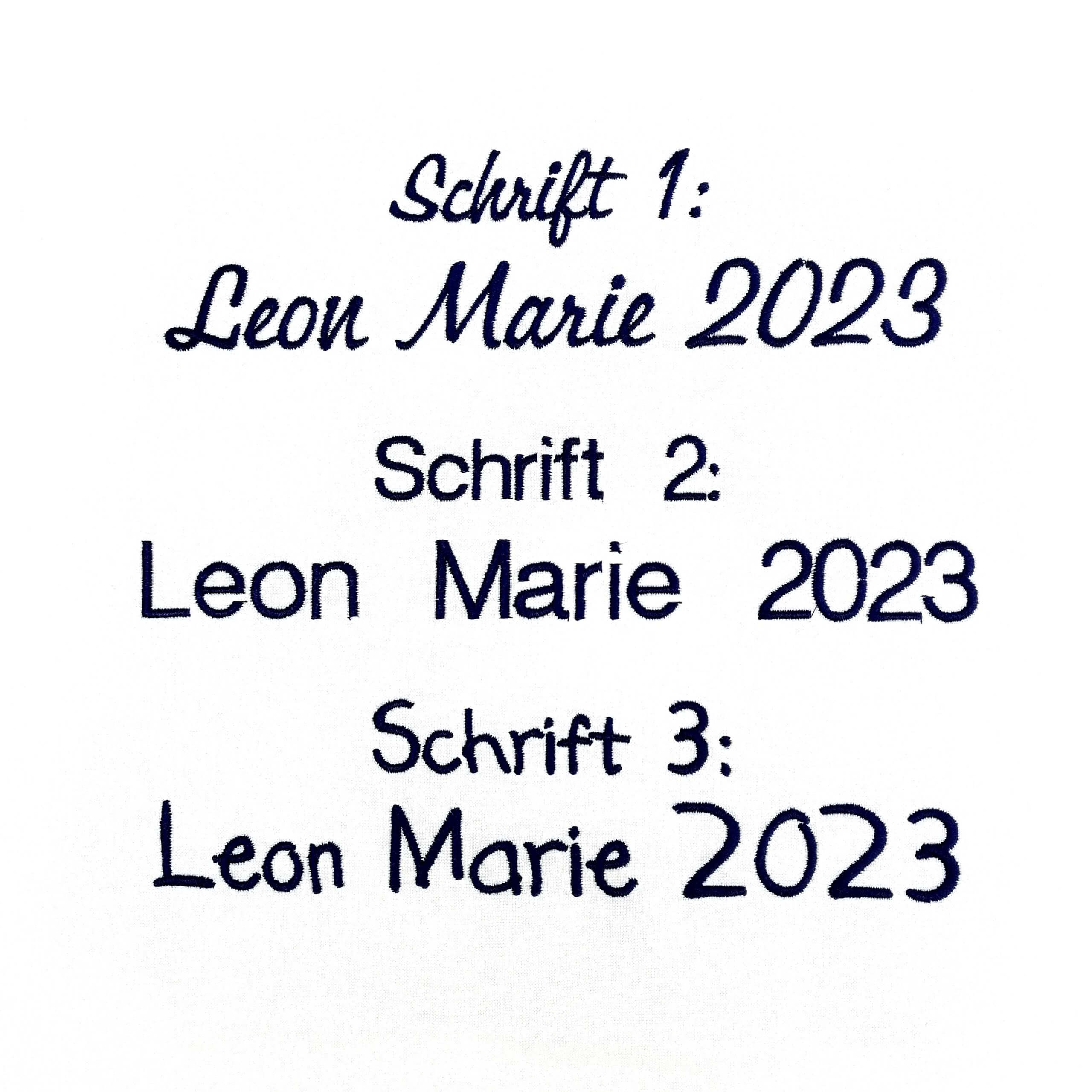 Die Schultüte kann mit Namen oder mit Name und Datum bestellt werden. Anstatt des Datums kann ich auch zb Schulkind 2025 sticken. Bitte gib bei der Bestellung auch an, in welcher Schriftart ich den Text sticken soll. Die Schriften findest du bei den Artikelbildern. Wenn du nichts angibst, verwende ich die Schriftart vom ersten Bild.