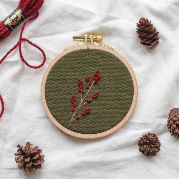 Der schlichte Zweig mit den fluffigen Beeren ist in einem 10cm großen Buchenholzstickrahmen und wird von mir mit Qualitätsgarn handgestickt.