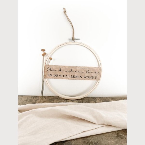 Stickrahmen „Glück ist ein Haus, in dem das Leben wohnt.“ (Blumendekoration nicht miteinbegriffen, nur für den Innenbereich vorgesehen.)