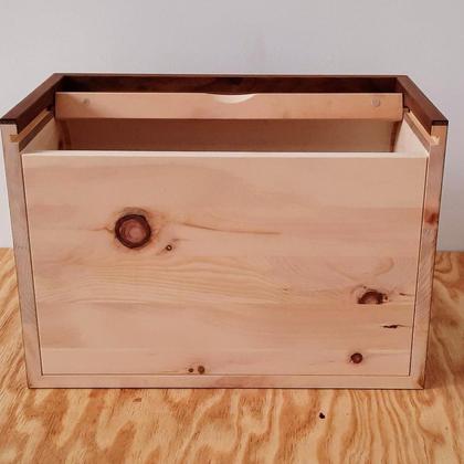 Stilvolle Zirbenbrotdose: Korpus: Nussbaum, innen Zirbenholz, Lamellen aus Zirbenholz.