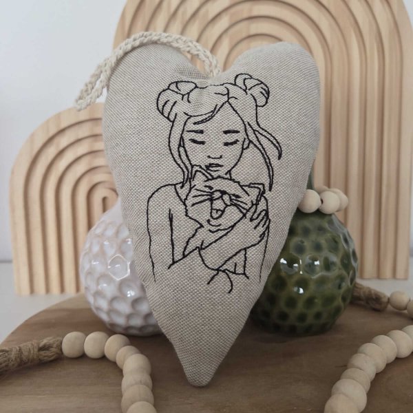 Du suchst eine hübsche Deko, ein kleines Mitbringsel für Deine Lieben, eine Deko für Deinen Sommerlichen Balkon ? Wie wärs mit dem traumhaft gestickten Herz mit dem süßem Katzenmädchen?