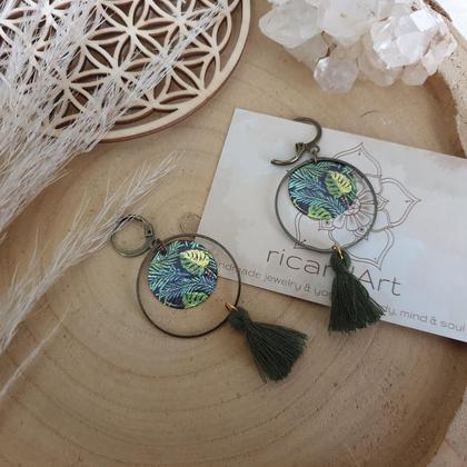 Von Hand gefertigte Ohrschätze mit bronzefarbenen, nickelfreien Brisuren (verschließbare Ohrhaken), 25mm Baumwolltasseln & Hoops mit 30mm Durchmesser in bronze aus robuster Metalllegierung. Mit Resin/Metallanhänger im Jungle-Design (2cm)