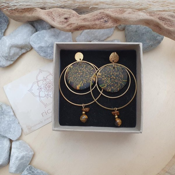 Individueller Ohrschmuck mit handgefertigten FIMO Applikationen in kräftigen Farbdesigns (jedes Paar wird aufgrund des individuellen Farbverlaufs zu einem Unikat). Bestückt mit natürlichem Tigerauge & Messinghoops mit 40mm äußererm Durchmesser. Die verwendeten Ohrstecker sind aus hochwertig vergoldetem Edelstahl & nickelfrei.