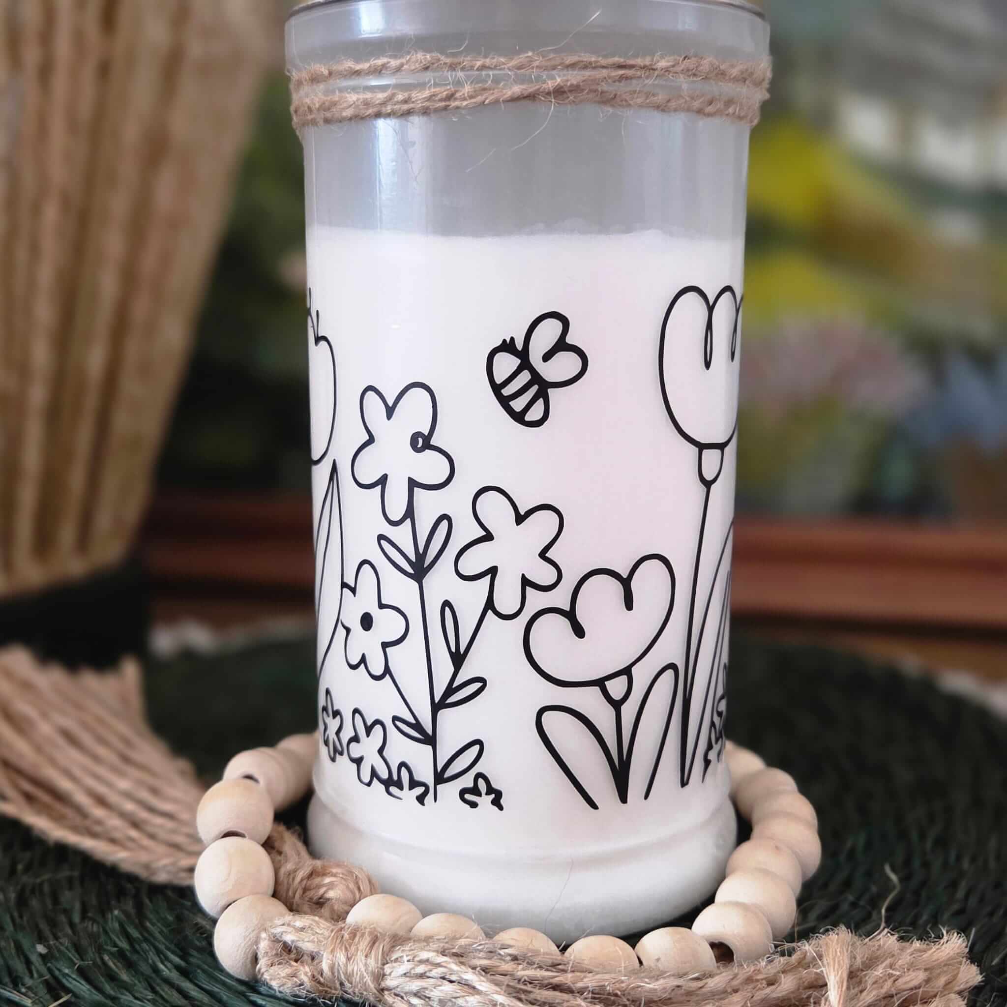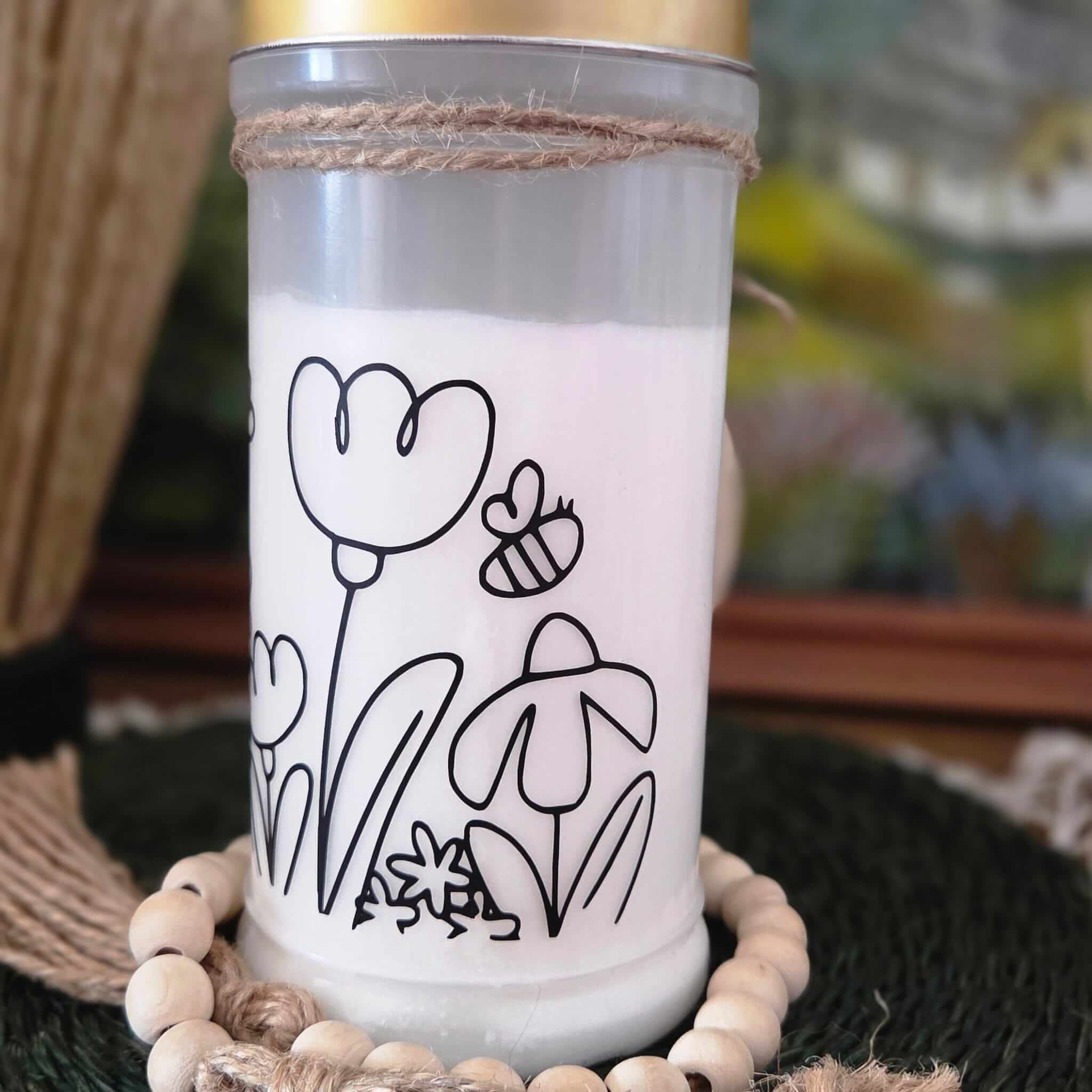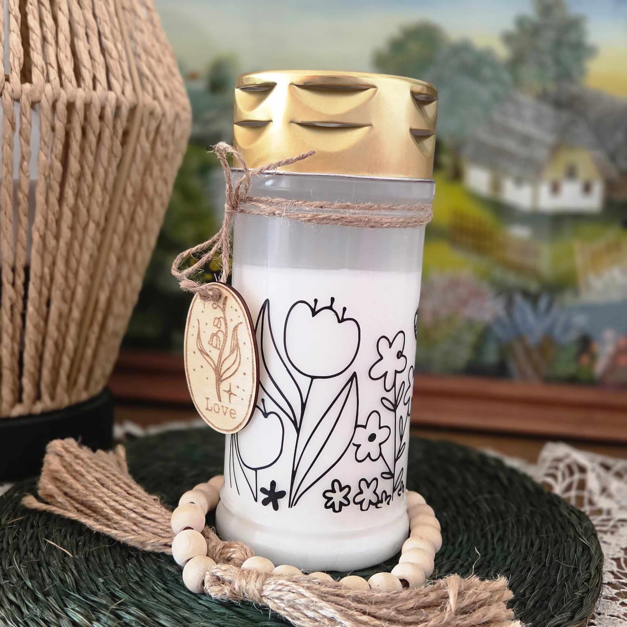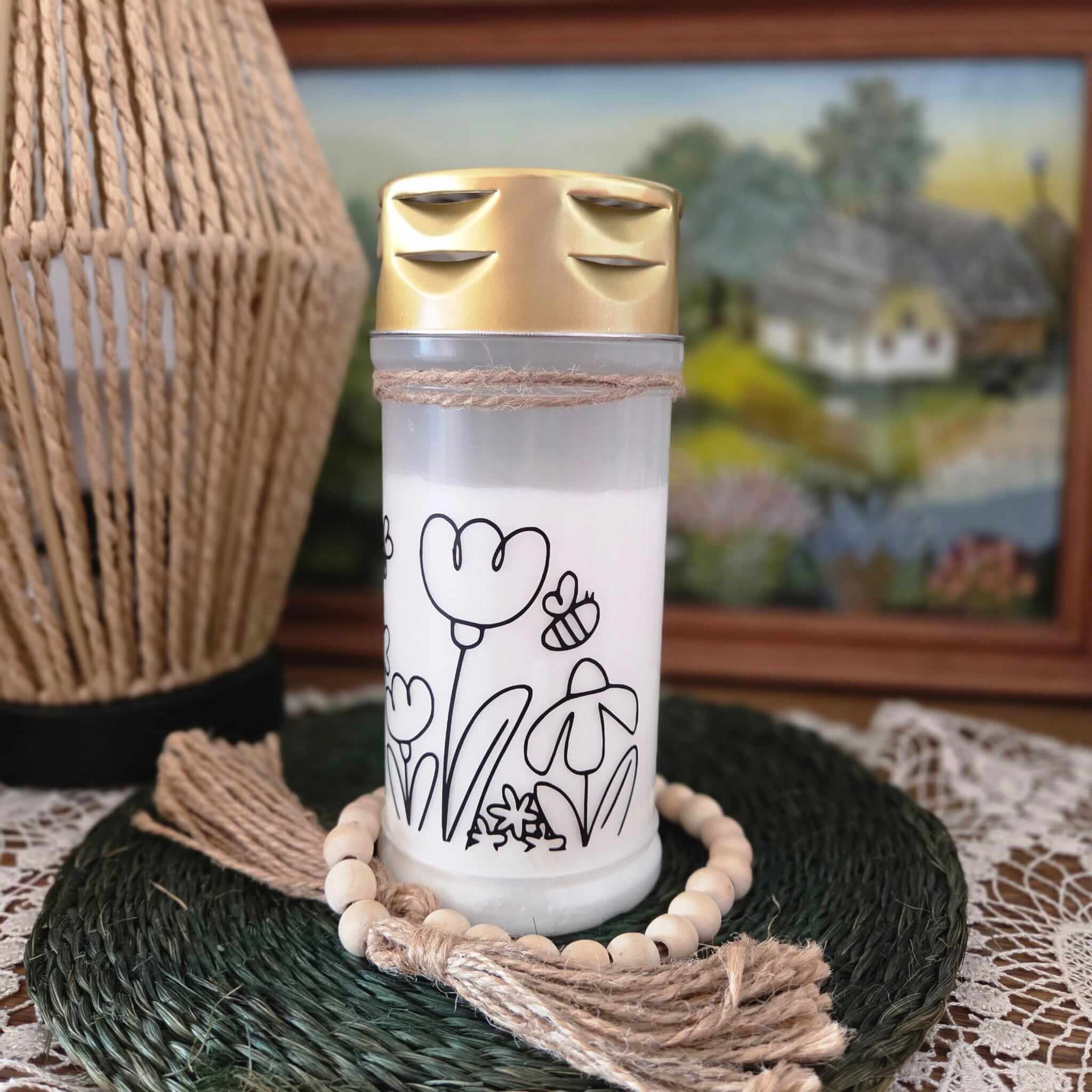 Ganz besondere Trauerkerze mit dem niedlicher Blumenwiese.