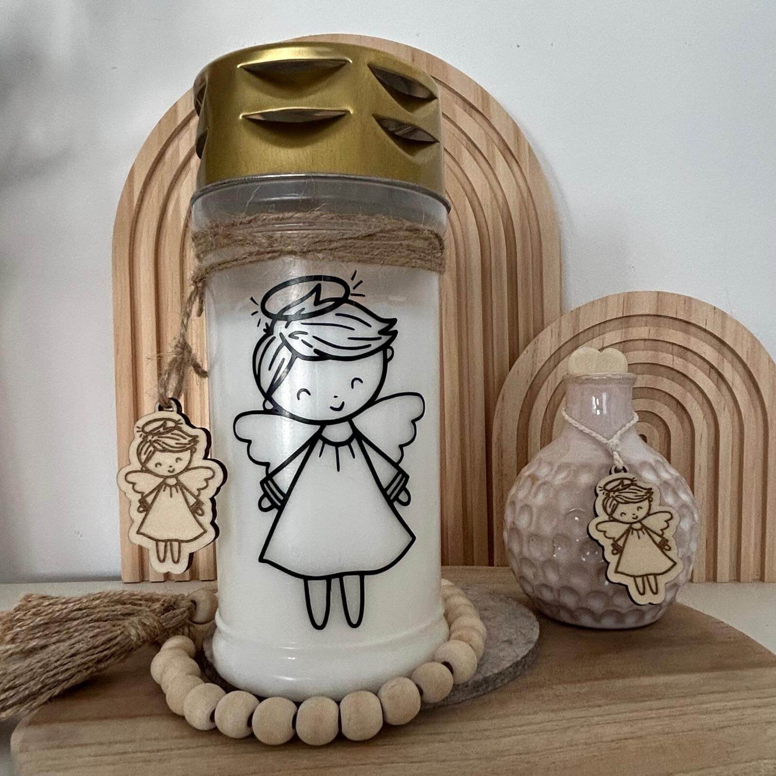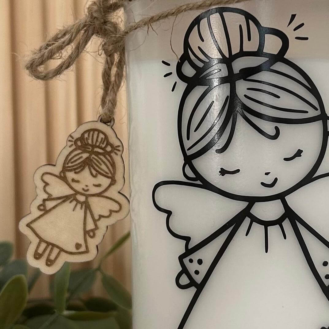 - Du bekommst hier eine handelsübliche 3 Tageskerze mit einem Engel PLott inkl einem kleinen Holzengel der aus Lindenholz gelasert wurde.