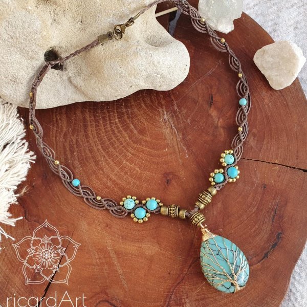 Von Hand geknüpfte Makrameehalskette aus gewachstem, sehr strapazierfähigem Makrameegarn (wasserfest) mit tropfenförmigem, in Kupferdraht gefasstem Türkis. Perlen: 6mm Türkisperlen & Messingperlen.