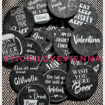 Die dunkelgrauen Untersetzer sind 10 cm im Durchmesser, ca 5 mm dick und wurden mit weißer Flexfolie von mir persönlich designt und beplottet.