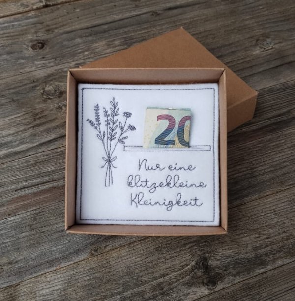 Ich habe meine Stickmaschine gestartet und diese Wunscherfüller gestickt. Hier haben nicht nur Geldscheine, sondern auch Gutscheinkarten perfekt Platz. Auch eine bekannte kleine quatratische Schokolade passt hier sehr gut rein. Eine hübsche Verpackung über die sich jeder freut.