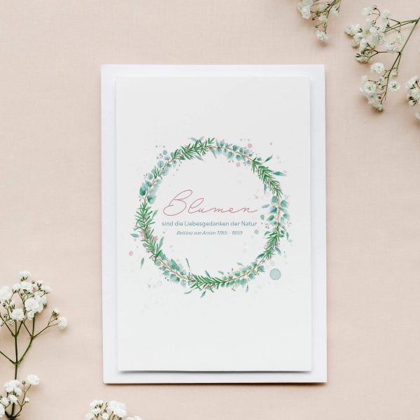 Diese zarte Grußkarte ziert ein Kranz aus Rosmarin und Eukalyptuszweigen sowie der inspirierende Spruch von Bettina von Arnim: „Blumen sind die Liebesgedanken der Natur"