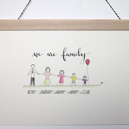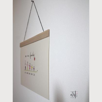 Häng'Art' (Fotokarton mit Holzleiste & Aufhängung oben) in A4 quer...Kalligrafieschriftzug 'we are family' + alle Familienmitglieder (evtl Haustiere) mit Namen