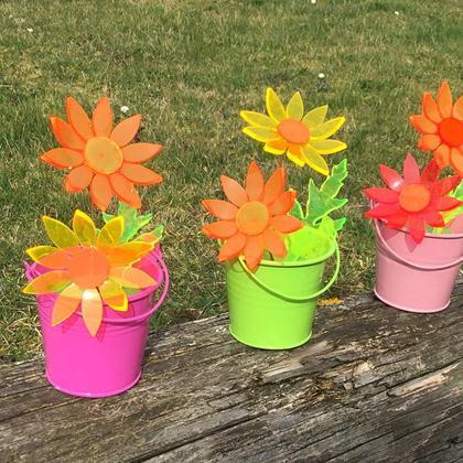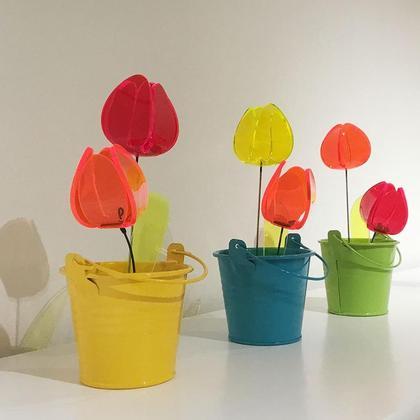 Blumen aus fluoreszierendem Plexiglas in bunten Eimern. Jedes Stück handgemacht. Blecheimer lackiert. Durchmesser 8 cm Bitte Farb- und Blumenkombinationen bei Bestellung angeben.