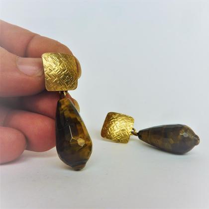 Silber vergoldet gehämmert Tigerauge fassetiert, schöner Lichteinfall Tropenform Ohrstecker ca 40 mm lang Oberfläche wild wie ein Tiger gehämmert