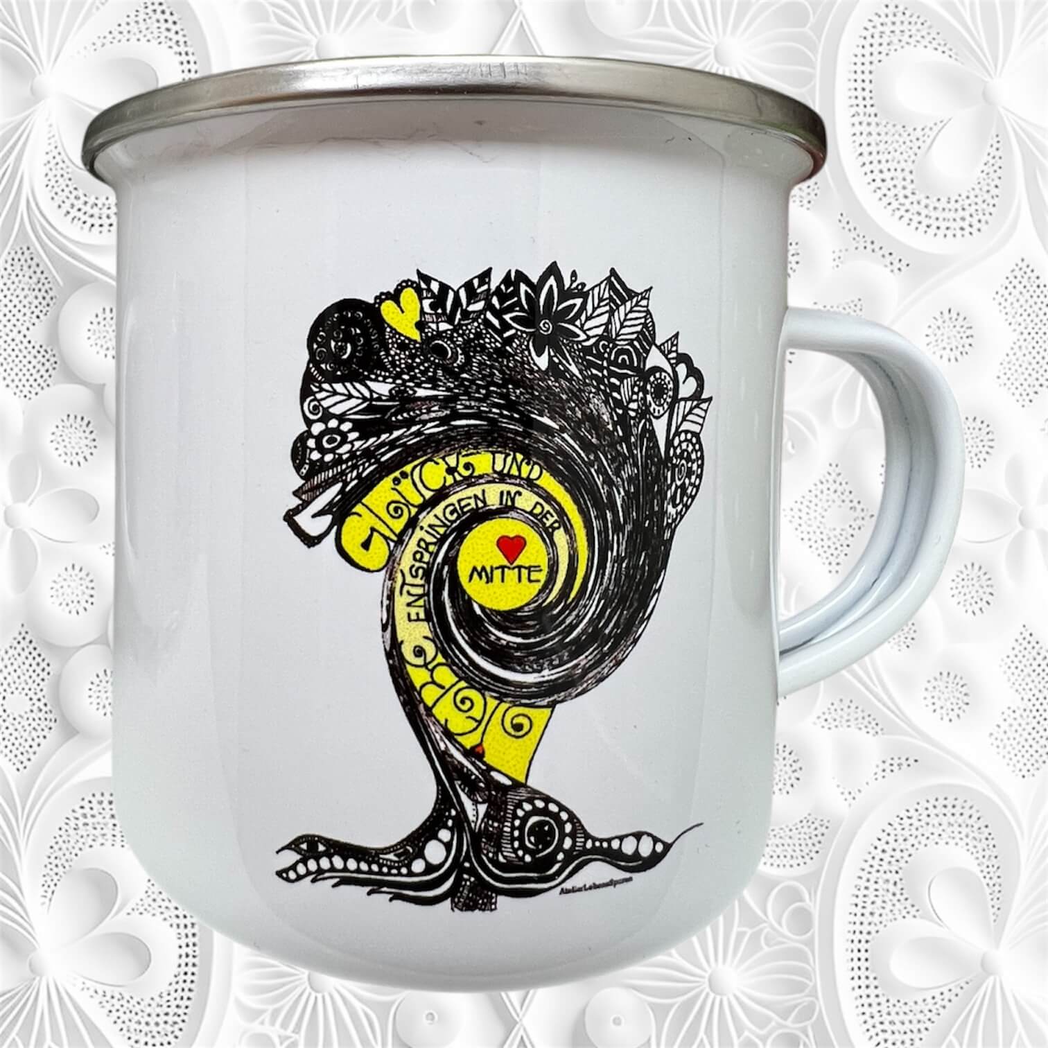 Meine neuen Emailtassen sind da und sie sind ganz unterschiedlich, genauso wie meine Art zu malen und zu schreiben. Dieser Schriftzug entstand in meiner Serie positive Wörter. GLÜCK und LIEBE entspringen in der Mitte. Eine wunderschöne Emailtasse, auch für unterwegs!