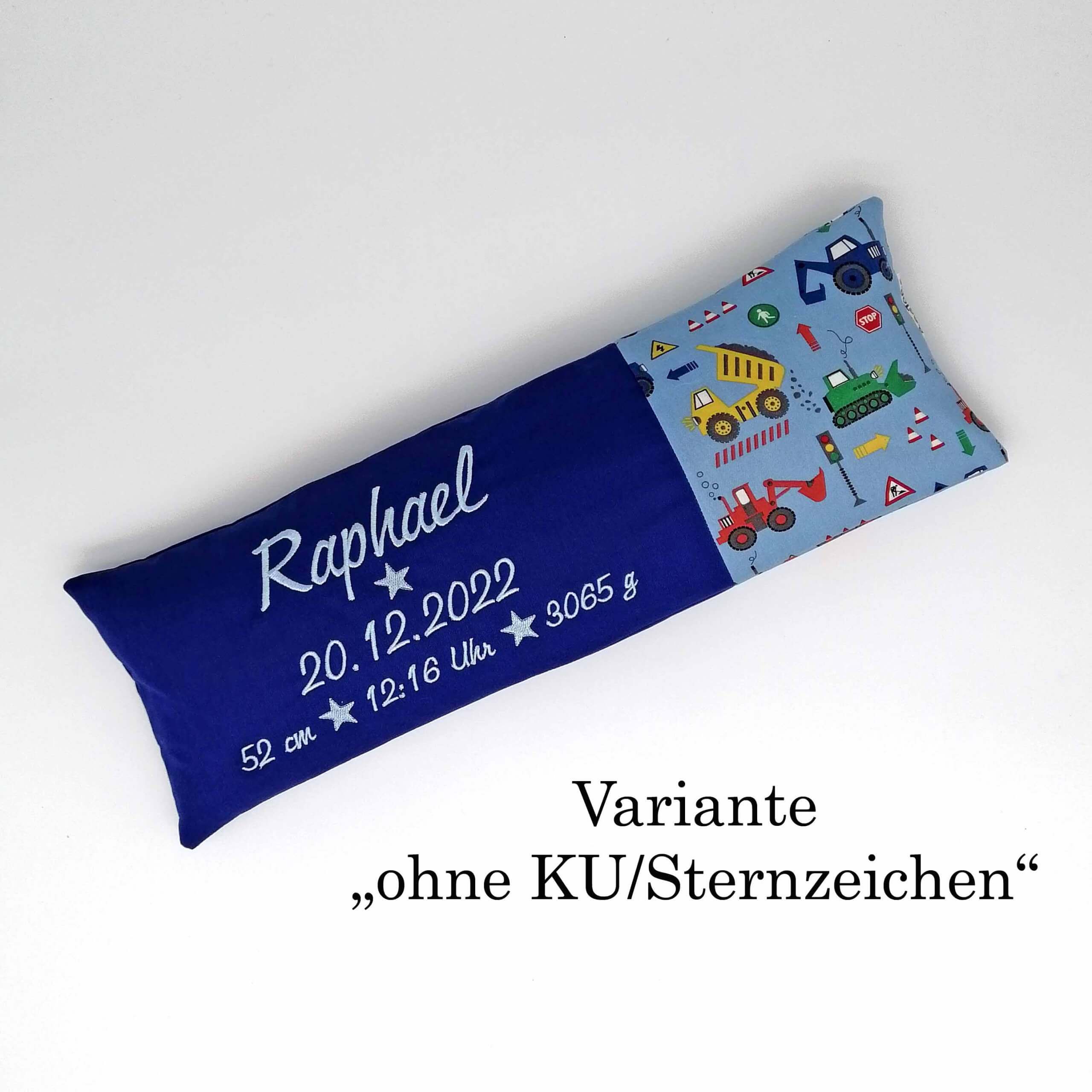 Die Geburtskissen von BagToBe sind das ideale Geschenk zur Geburt, als lange bleibende Erinnerung und auch für Meilenstein-Fotos. Sie werden nach den Maßen des Babys genäht. Innen ist ein Innenkissen, welches mit Reis gefüllt ist (bzw. man selbst mit Reis oder ähnlichem füllt, wenn man es ohne Füllung bestellt). Es besitzt einen Reißverschluss, sodass man den Reis zum Beispiel fürs Waschen herausleeren und einfach wieder einfüllen kann. Der Bezug ist mit einem Hotelverschluss ausgestattet und somit schnell und einfach abnehmbar und ebenfalls waschbar. Folgende Maße hat das Kissen: Länge des Kissens: Größe des Kindes (Abweichung +-1cm) Umfang des Kissens: Kopfumfang des Kindes (+-1 cm) Füllung: Gewicht des Kindes (+-50g) Hinweis: Zum Wiegen verwende eine Babywaage oder eine Küchenwaage. Die Länge des Kissens wird von Ecke zu Ecke gemessen. Für die Messung des Umfangs den Reis gleichmäßig verteilen. Um das Kissen individualisieren zu können brauche ich von dir folgende Angaben: --> das Gewicht des Kindes --> die Größe und den Kopfumfang (wird der Kopfumfang nicht angegeben verwende ich einen Durchschnittswert) --> den Namen --> das Geburtsdatum und die Uhrzeit --> ev. das Sternzeichen (je nach gewählter Variante) Bitte kontrolliere die Daten sorgfältig! Die Lieferzeit beträgt 4-8 Werktage. Wichtiger Hinweis: das Kissen ist kein Spielzeug und darf nicht unbeaufsichtigt in die Nähe des Kindes gelangen!