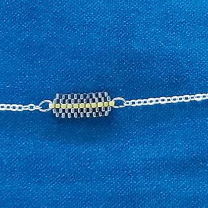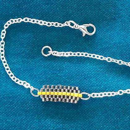 Armkettchen I, ca. 18 cm lang - Mittelstück im Ziegelstich mit Miyuki-Delica-Perlen 11/0 grau-silverlined/gelb, zartes Erbsenkettchen mit echt rhodinierte Tombak Metalllegierung (nickel-, blei- und kadmiumfrei) silberfarbig und Karabiner;