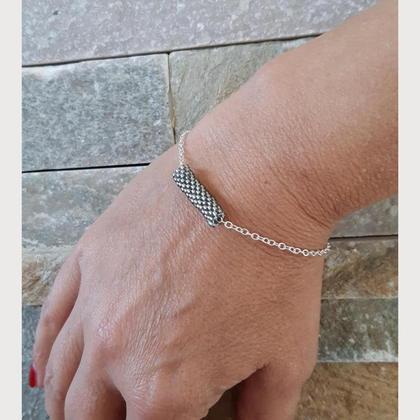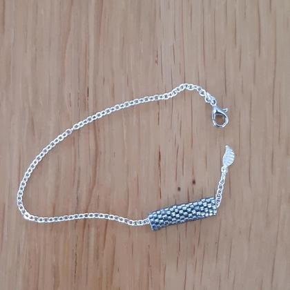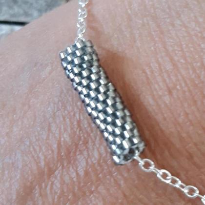ca. 18,5 cm lang - Mittelstück händisch gefädelt im Ziegelstich mit Miyuki-Delica-Perlen 11/0 grau/silverlined, zartes Erbsenkettchen silberfarbig mit echt rhodinierte Tombak Metalllegierung (nickel-, blei- und kadmiumfrei), Karabiner und Blatt-Charmanhänger;