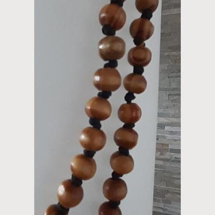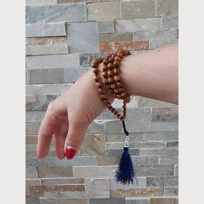 Eine MALA (Gebetskette), handgeknüpft mit reißfestem, schwarzem Macramegarn, 108 helle Holzperlen (6 mm), dunkelblauer Quaste, Kaschierperle aus tibetanischem Silber, ca 74 cm Umfang (+ 10 cm Abschluss)
