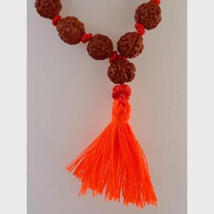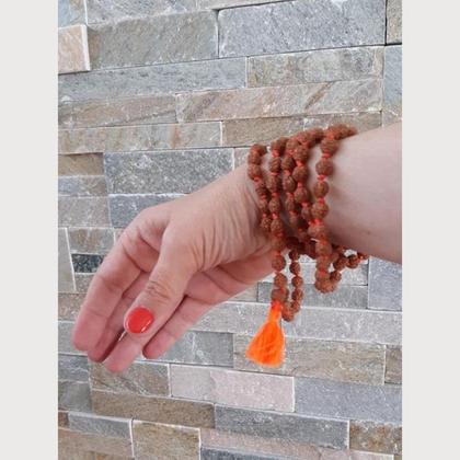 Eine MALA (Gebetskette), handgeknüpft mit reißfester korallroter Perlseide natur, 108 ECHTE Rudraksha Samen Perlen (10 mm) + 1 Guru-Perle, orange Quaste, ca 102 cm Umfang (+ 4 cm Abschluss); Rudraksha-Ketten in der modernen Welt: Heutzutage erfreuen sich Ketten aus Rudraksha besonders in Indien und auf Bali immer noch großer Beliebtheit. Sie gelten als Schutz vor negativen Energien und beleben durch ihre spezielle Oberflächenstruktur das Nervensystem. Wenn man mit den Fingern über die Perlen streicht, fühlt sich dies wie eine kleine Massage für die Fingerkuppen an. Gerade deshalb eignen sich Rudraksha besonders gut zur Meditation und werden auch bei westlichen Yogis immer beliebter. Viele Yogis tragen die Ketten auch einfach bei sich, um sich im Alltag an ihre Yogapraxis zu erinnern und die positive Energie der Ketten zu nutzen.