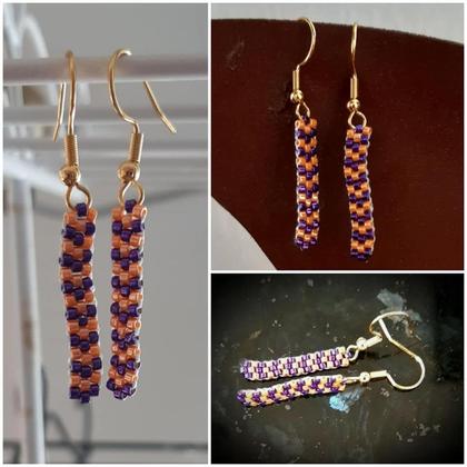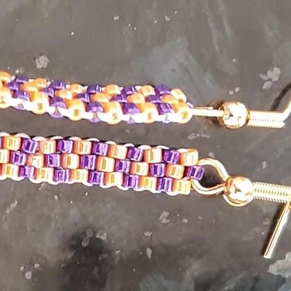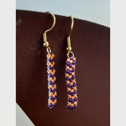 ca. 4 cm lang - händisch gefädelt im Ziegelstich mit Miyuki-Delica-Perlen 11/0 in orange/violett, Ohrhaken aus Edelstahl der Klasse 304 mit einer goldfarbigen Galvanisierung;