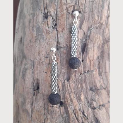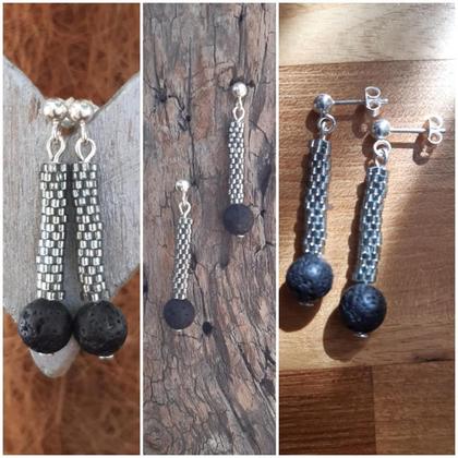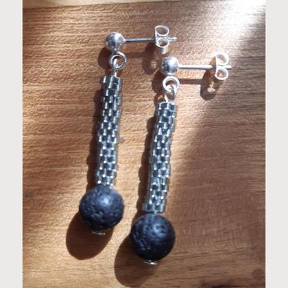 handgefädelt im Ziegelstich mit Miyuki Delica 11/0 in grau/silverlined, echte Lavaperle, Silberstecker echt silber, ca 4 cm lang;