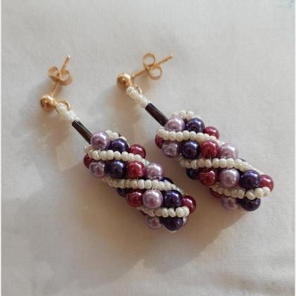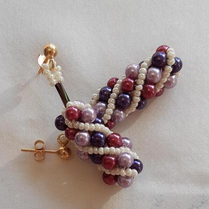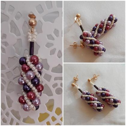 Spiralperlenohrringe GW I, ca 5 cm lang, handgefädelt mit 4 mm Glaswachsperlen in violett/beere/veilchenblau und Rocailles 11/0 (ca 2 mm) in elfenbeinweiß, Silberstecker in echt silber mit echter Vergoldung 3µ;