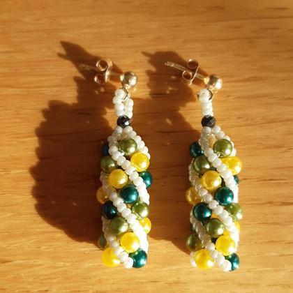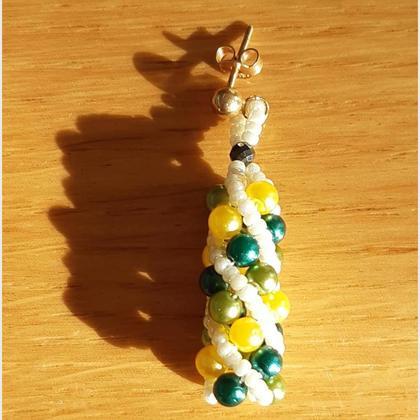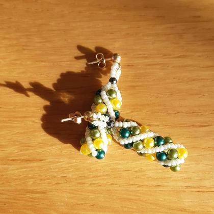 handgefädelt mit 4 mm Glaswachsperlen in tannengrün/olivgrün/sonnengelb, Rocailles 11/0 (ca 2 mm) in elfenbeinweiß und einer facettierten anthrazit Perle, Silberstecker in echt silber mit echter Vergoldung 3µ;
