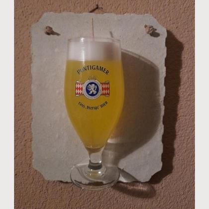 Das Bierglas wurde in eine Platte, gefertigt aus weissem Marmor- und feinem Quarzsand betoniert. Das Glas wird mit einem mit Kerzenwachs gegossen, das es wie ein richtiges Bier aussieht. Die Kerze ist normal abbrennbar. Das Glas ist individuell je nach Brauerei und Sorte, mit kurzer Wartezeit machbar. Das Glas kann mit normalen Wachs oder transparentem Gelwachs gegossen werden und die Schaumkrone ist immer normales Wachs.