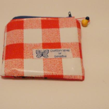 Dieses Krimskramstäschchen ist innen und auf der Rückseite aus Wachstuch genäht und kann leicht ausgewischt werden. Die Vorderseite ist aus Baumwollstoff. Es ist 11 cm x 10 cm groß.