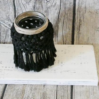 Das Teelichtglas wurde aus Makrameegarnen geknüpft und ist der Hingucker - nicht nur im Wohnbereich, sondern auch auf Terrasse oder Balkon. Die Kerze gibt ein wunderbares Licht ab und schimmert durch die Garne. Das Glas ist 11 cm hoch und hat einen Durchmesser bei der Öffnung von 6 cm.