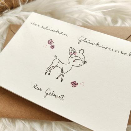 Diese Babykarte ist ein von mir, mit viel Liebe erdachtes, entworfenes und //handgemachtes Original//. Der Schriftzug, Herzlichen Glückwunsch zur Geburt, ist standardmäßig auf der Karte. Das Rehlein ist gezeichnet und mit rosa Details verziert. Gerade die Geburt eines Kindes ist ein besonderer Anlass. Hier eignet sich dieses einzelstück ideal um den neuen Eltern eine Freude zu machen. Die Klappkarte ist A6 aus 300g/m² Aquarell-Papier und wird mit einem farblich passendem Kuvert C6 geliefert. Da es sich um handgemachte Originale handelt, sind Abweichungen von den Bildern ganz normal. Folge mir auf Instagram: christinas_einzelstuecke