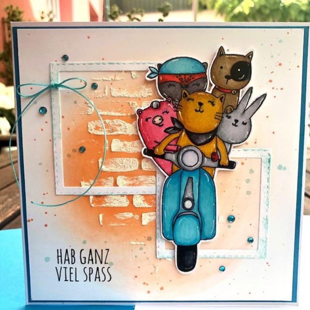 Quadratische Glückwunschkarte zu div. Anlässen. Die Karte ist mit viel Liebe zum Detail von mir gestaltet und die Rollerbande selbst coloriert. Inkl. Kuvert