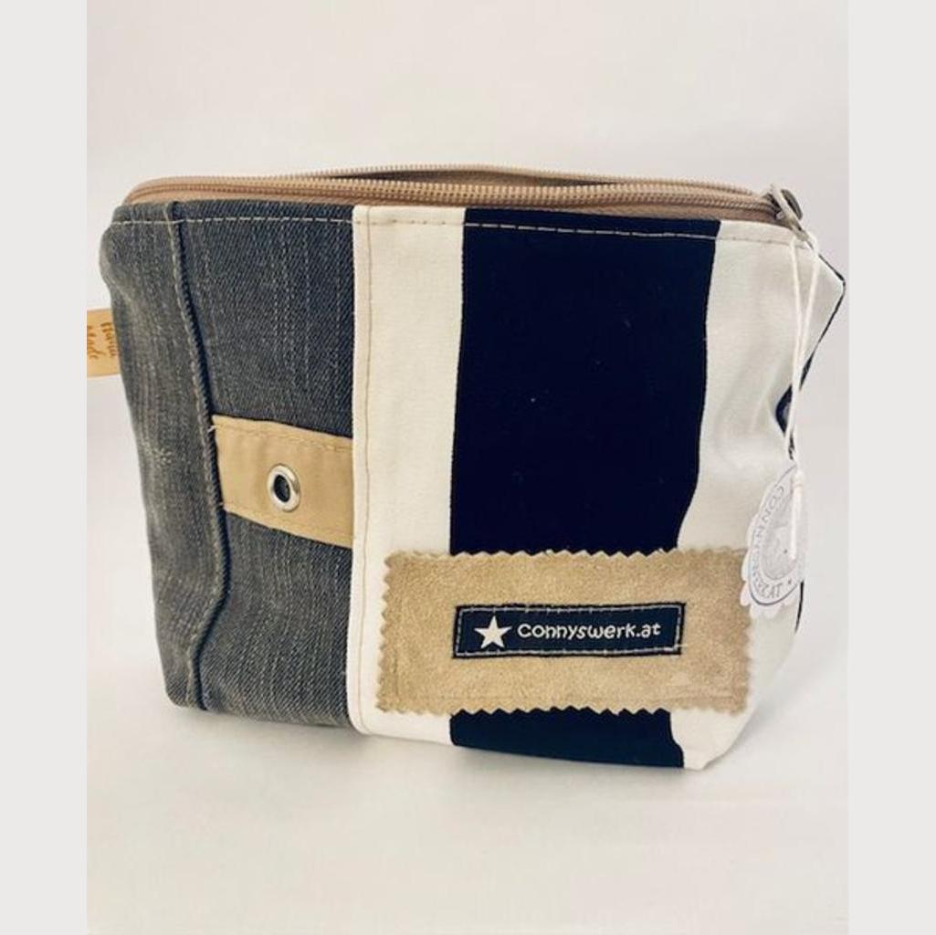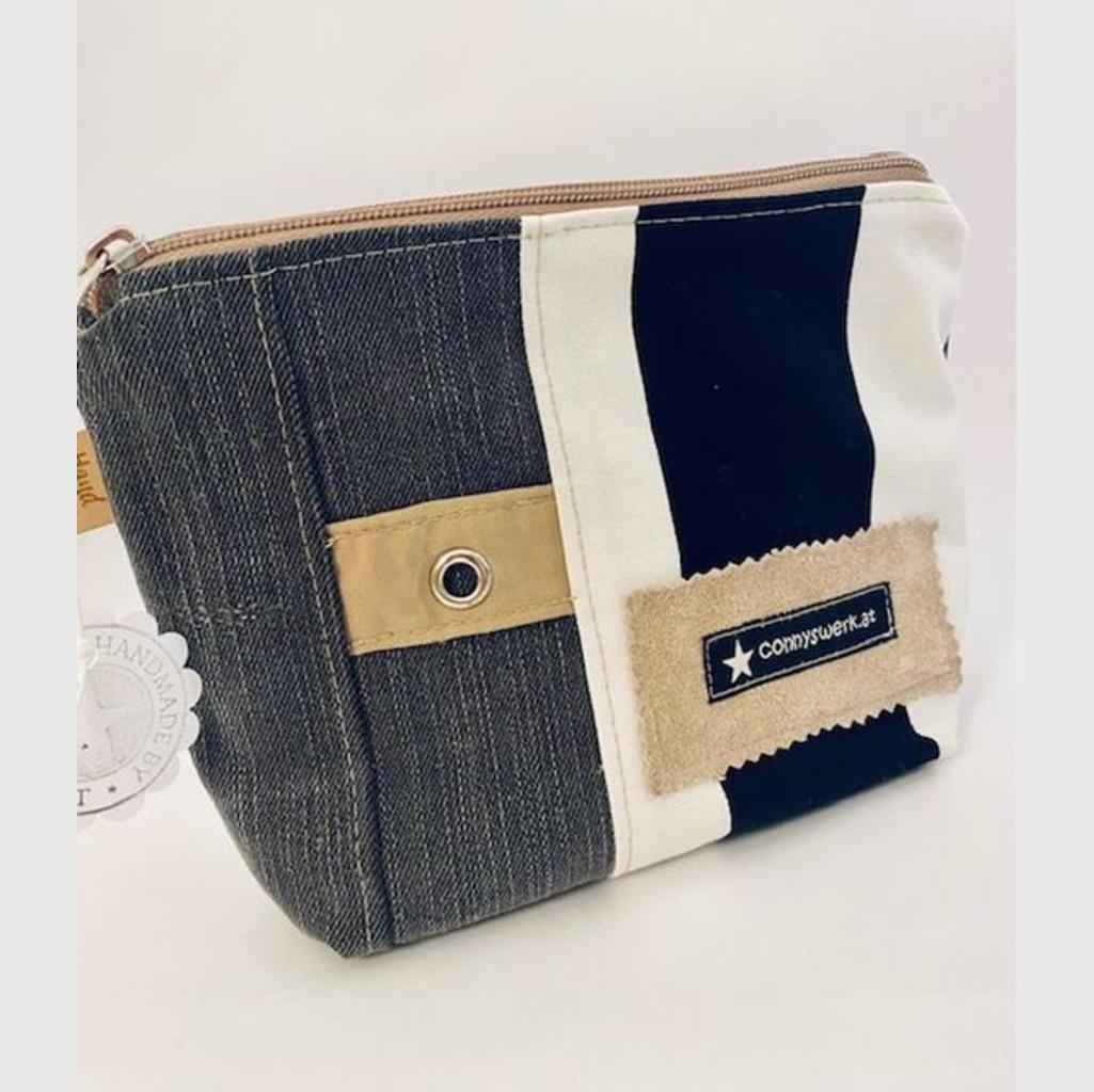 Kosmetiktasche aus Jeans-Upcycling und Baumwollstoffen mit den Maßen B 21x H16cm