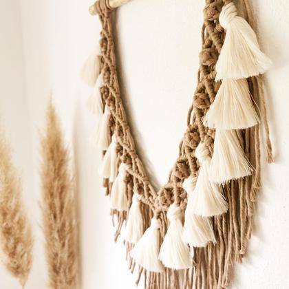 --Wandbehang "Meeko"-- in der Farbe Natur/ Sand Schönes Design, verziert mit süßen "Berryknots". Vervollständigt wird "Meeko" durch die flauschigen "Quasteln" in der Farbe Natur. Maße: ca. 40cm x 30cm