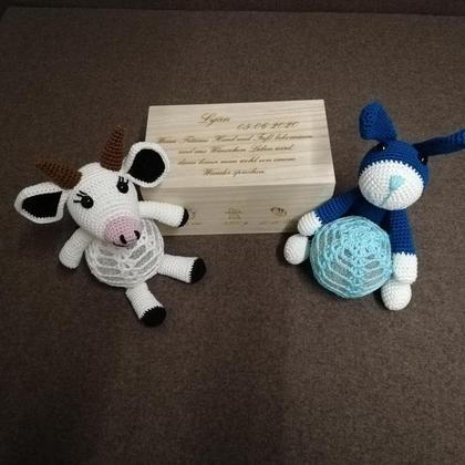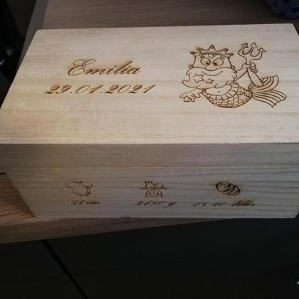 Holzkisterl mit Deckel, graviert mit Wunschdaten, Muster, Sternzeichen usw. Größe: 20x12x9 cm. Dazu ein süßes von Hand gehäkeltes Nachtlicht.