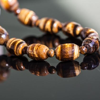 Tigerauge – Halskette Diese Halskette wurde aus facettiertem Tigerauge(17mm lang) und Tigerauge-Kugeln(4mm) hergestellt. Ihre Gesamtlänge beträgt etwa 48,5cm. Geschlossen wird diese Halskette durch einen goldfarbenen Magnetverschluss.