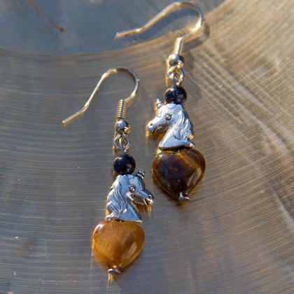 Edelstein-Ohrhänger mit Tigerauge-Herz, Blaufluss-Kugel und Einhorn-Anhänger. Auf Wunsch können für Allergiker auch Edelstahl-Ohrhaken montiert werden. Länge ohne Haken 25mm