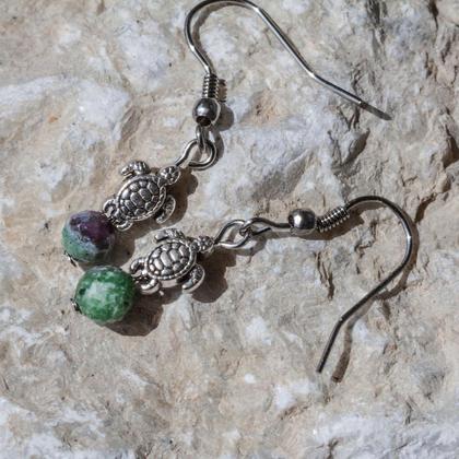 Ohrhänger mit Rubin-Zoisit-Kugel und voll ausgeformter Schildkröte. Mit Edelstahl-Ohrhaken, für Allergiker geeignet. Länge ohne Haken 16mm