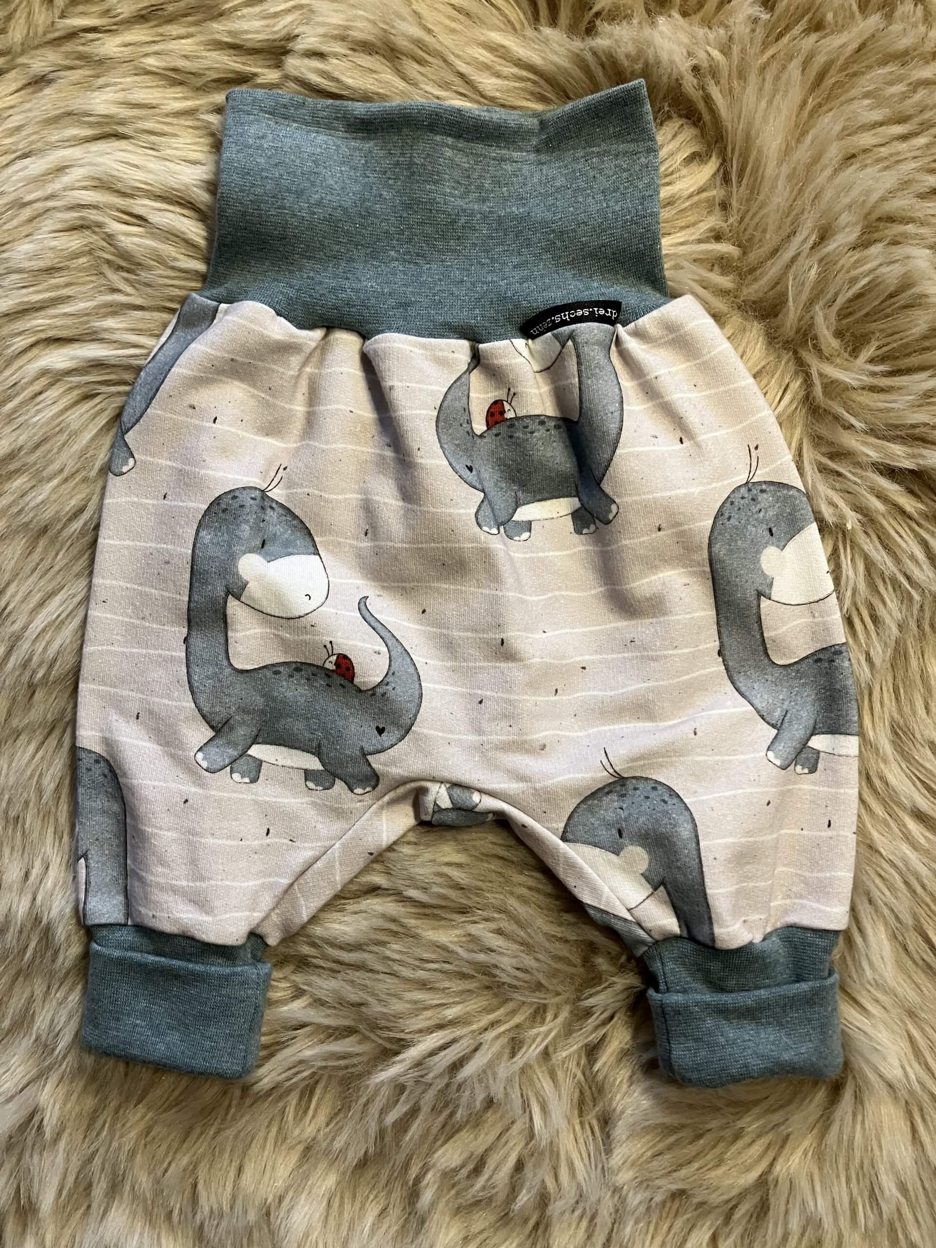 Pumphose "Dino" in der Größe 62/68, aus Baumwoll-Sweatstoff (95% Baumwolle, 5% Elasthan), genäht im Burgenland.