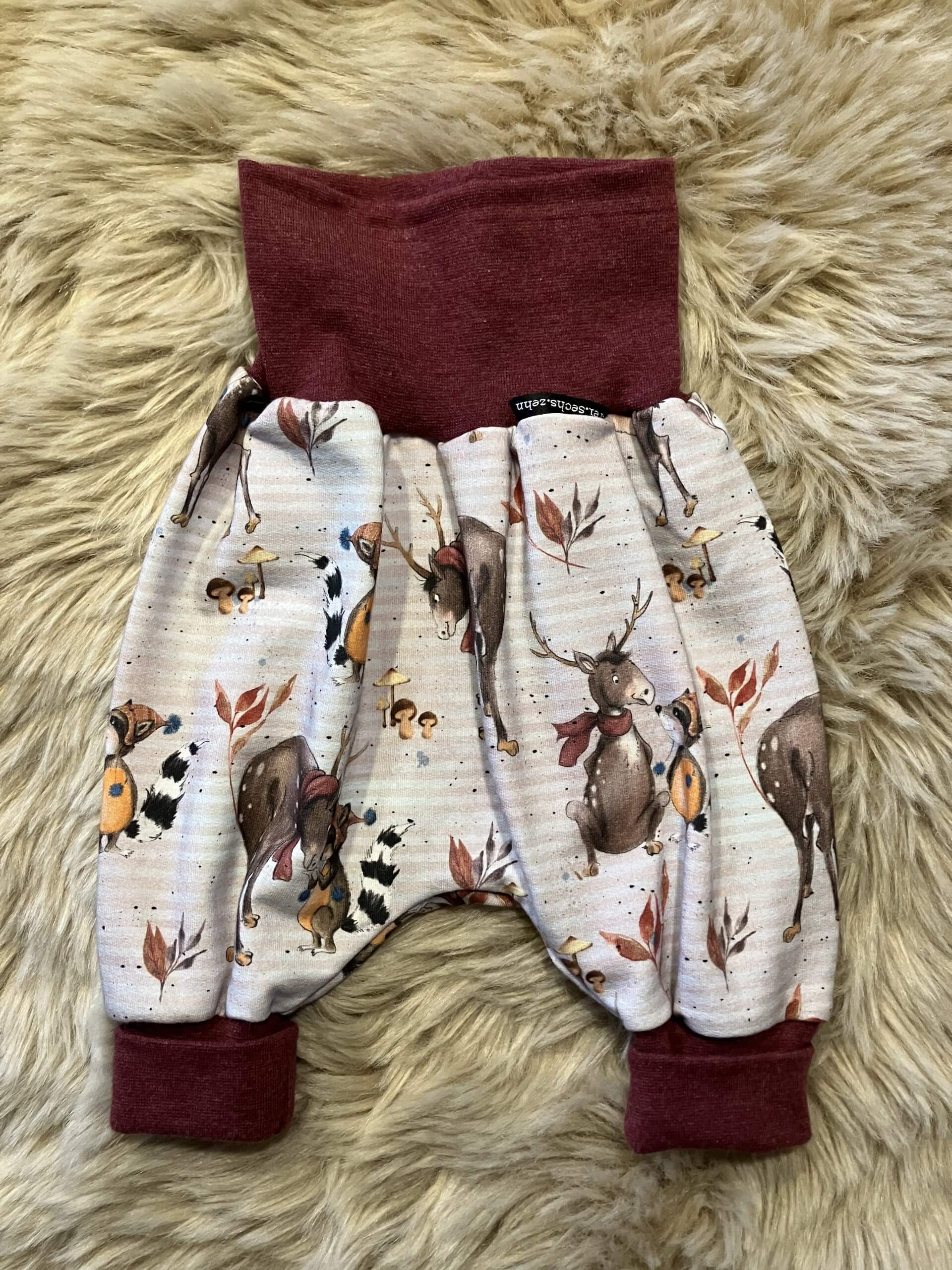Pumphose "Waschbär" in der Größe 62/68, genäht aus Baumwollsweatstoff (95% Baumwolle, 5 % Elasthan), über zwei Größen mitwachsend, handmade im Burgenland