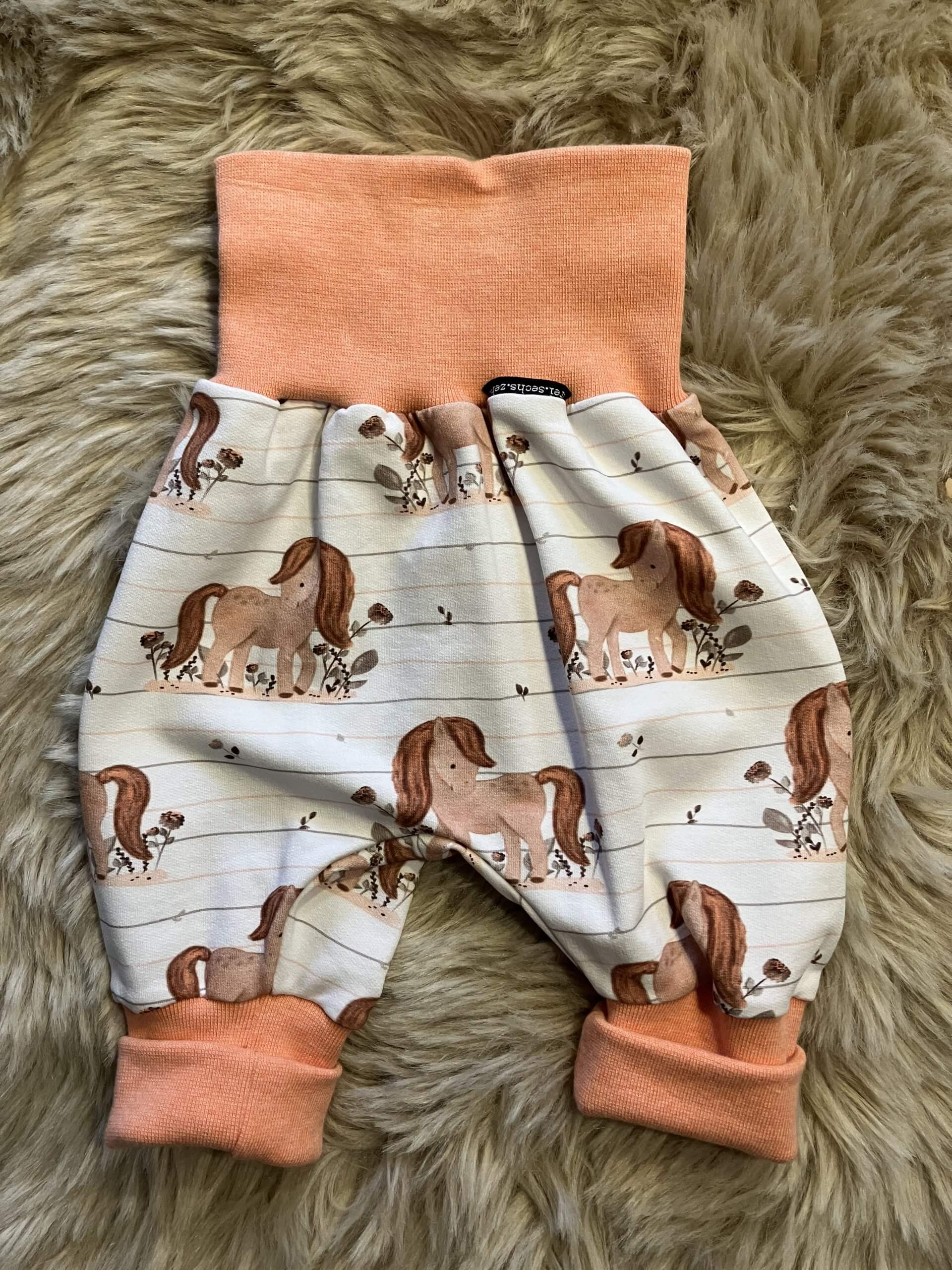 Pumphose "Pony pfirsich" in der Größe 62/68, aus Baumwoll-Sweatstoff (95% Baumwolle, 5% Elasthan), genäht im Burgenland.