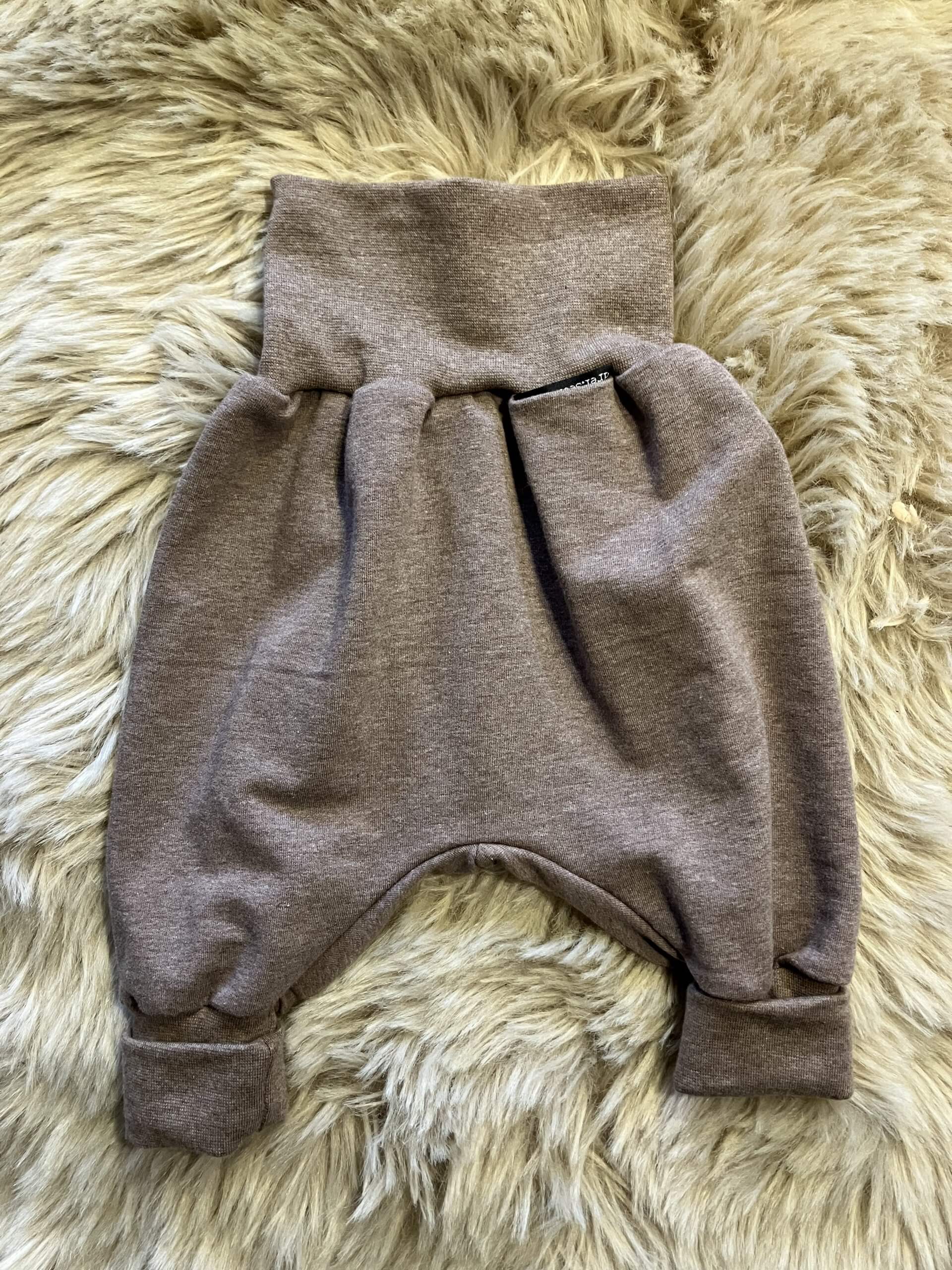Pumphose "schlamm-meliert" in der Größe 62/68, aus Baumwoll-Sweatstoff (95% Baumwolle, 5% Elasthan), genäht im Burgenland.
