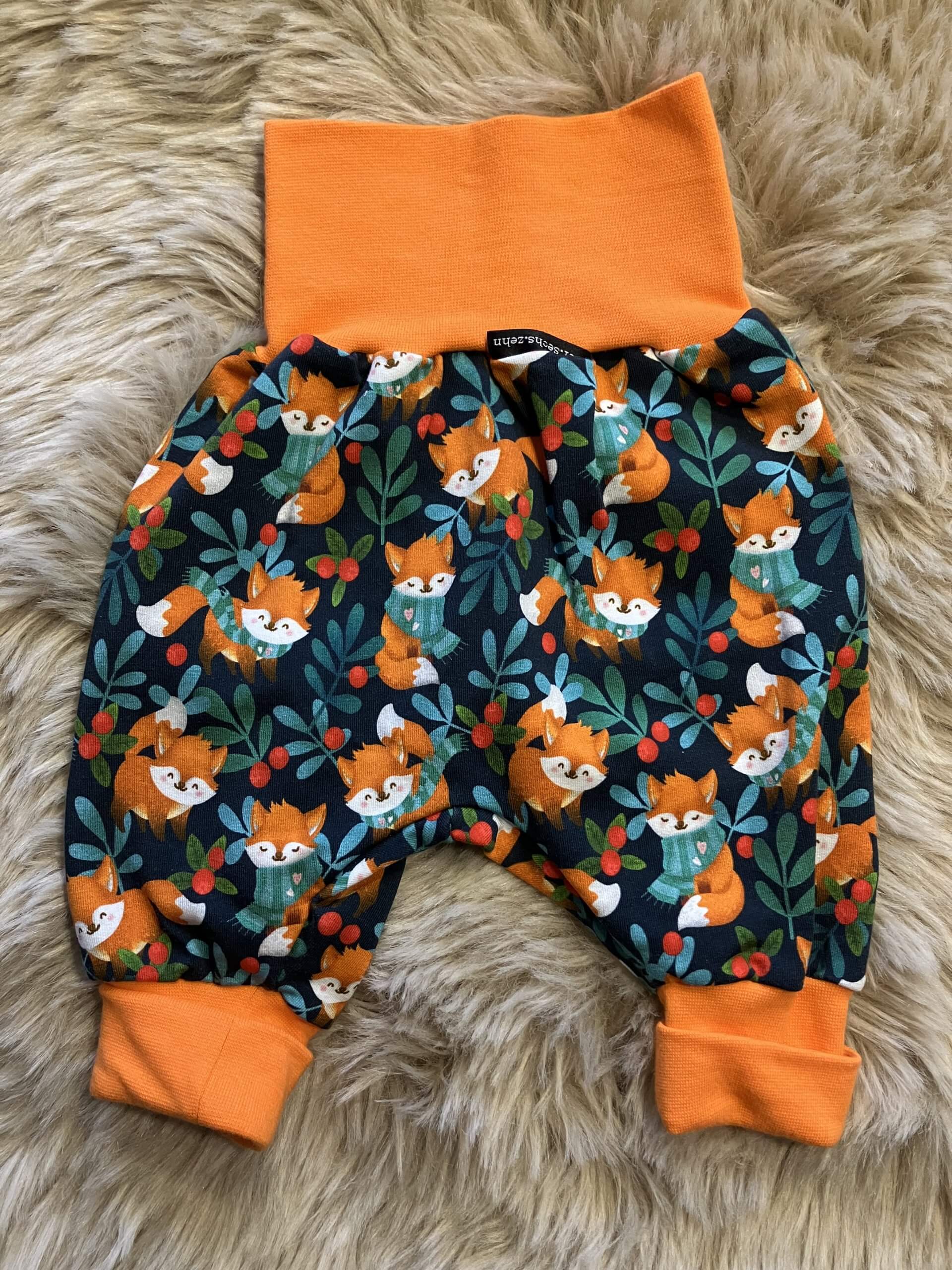 Pumphose "Fuchs" in der Größe 62/68, aus Baumwoll-Sweatstoff (95% Baumwolle, 5% Elasthan), genäht im Burgenland.